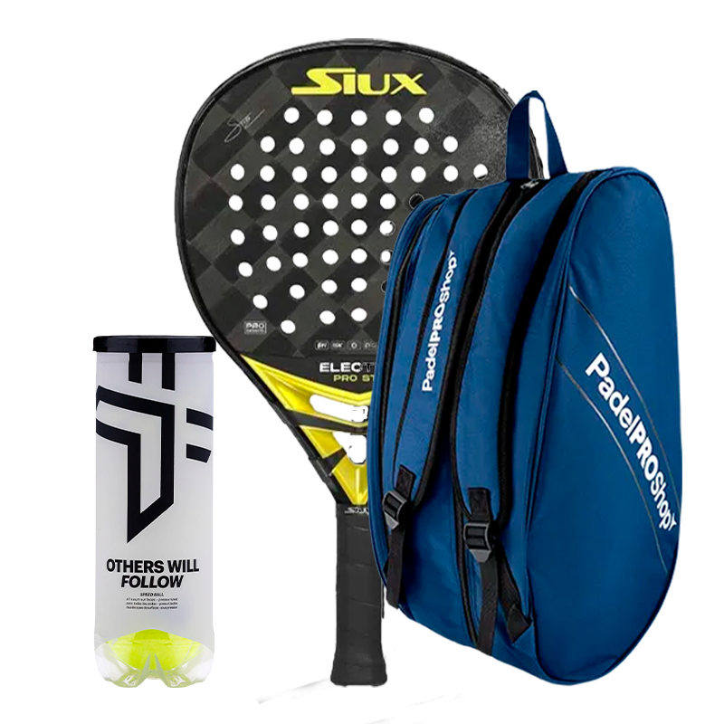 Packen Padelschläger Siux Electra ST3 Stupa, die Padelschläger von Jon Sanz, hergestellt mit einer tropfenförmigen Form und einem EVA Pro-Gummikern, Padel-Taschen Schwarz PadelPROShop und Bälle Oxdog.