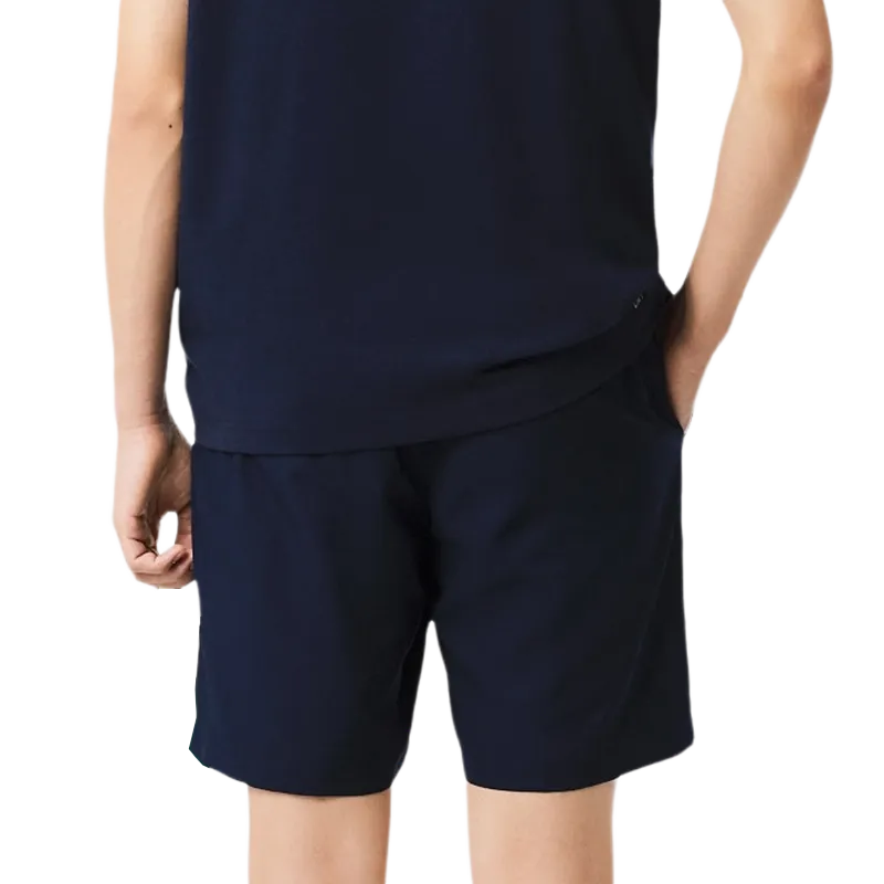 Die Hose Lacoste Blau Marine 2025 Es hat einen entspannten Schnitt und einen leichten Diamant-Taftstoff, der ganztägigen Komfort garantiert. Sein elastisches Gewebe bietet große Bewegungsfreiheit, ideal für alle, die ein vielseitiges und bequemes Kleidungsstück suchen. Es hat eine Schritthöhe von 21,5 cm und das charakteristische gestickte Krokodil am Bein sorgt für eine besondere Note. Für eine perfekte Passform empfehlen wir, eine Größe kleiner als üblich zu wählen.