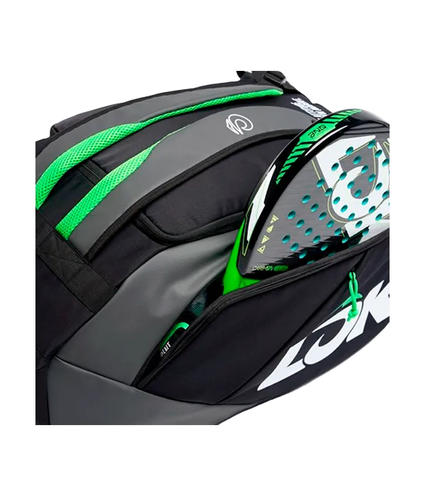 Padel-Tasche Lok Maxx-Schwarz 2024 mit einem Hauptfach, in dem Sie auch einen Laptop verstauen können. GDank des hinteren Kapselsystems erhalten Sie die bestmögliche Polsterung im Rückenbereich.