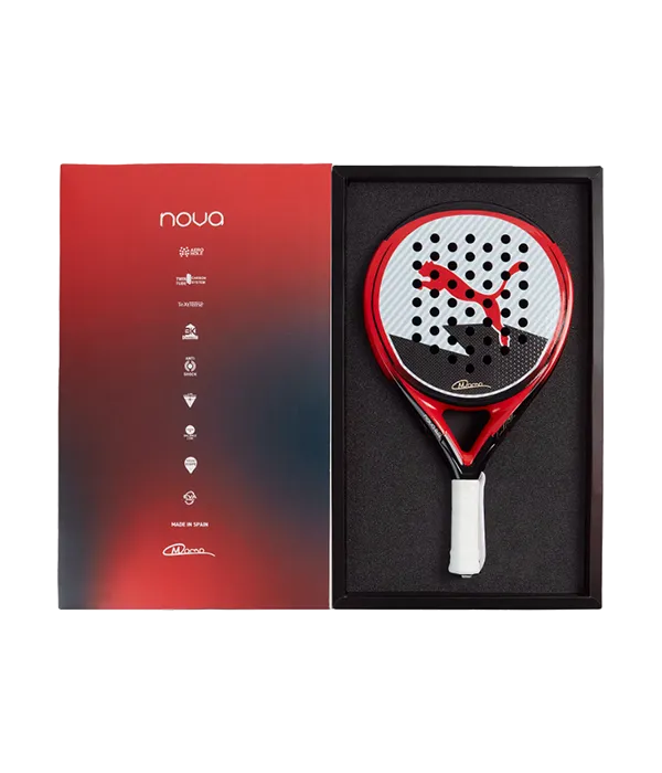 Racket Puma Nova Elite 2024 Momo Gonzalez designed for advanced level players. Featuring a 3k carbon fiber frame with a double tubular rim and a foam core, more robust than its predecessor to improve responsiveness. Thanks to its round shape, you will be able to control your game and hit with greater precision. And its powerful color combination will be the attraction of the court. It includes the signature and logo of Momo González on its faces. With a low balance it also has a 100% carbon fiber double tubular frame.