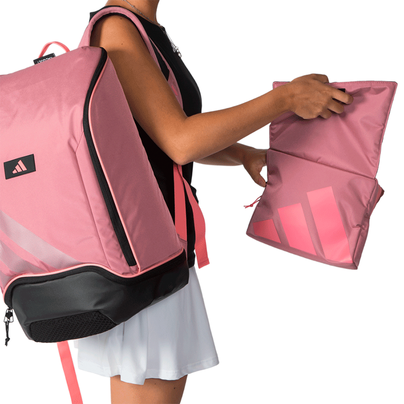 toiletry bag Adidas Pink Martita Ortega 2026 designed for players who value organization. Spacious main compartment for accessories padel and personal items, complemented by a mesh pocket on the flap that keeps small items visible and within reach. Double zipper and velcro system ensures the protection of your belongings at all times. Exclusive pendant signed by Martita Ortega.