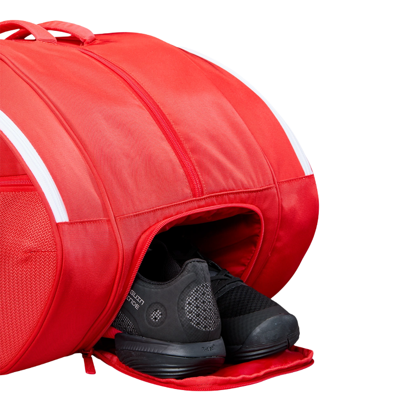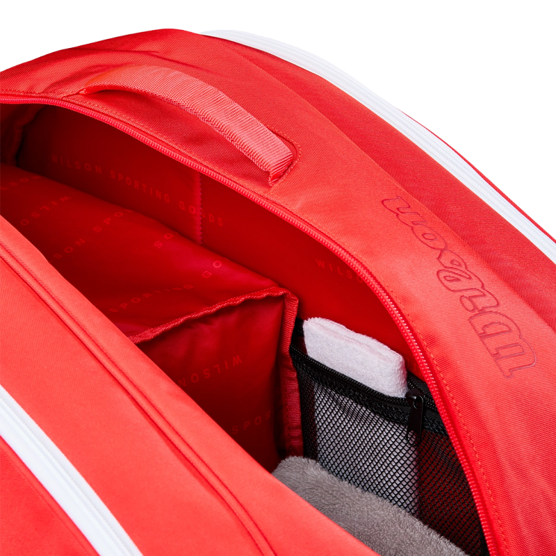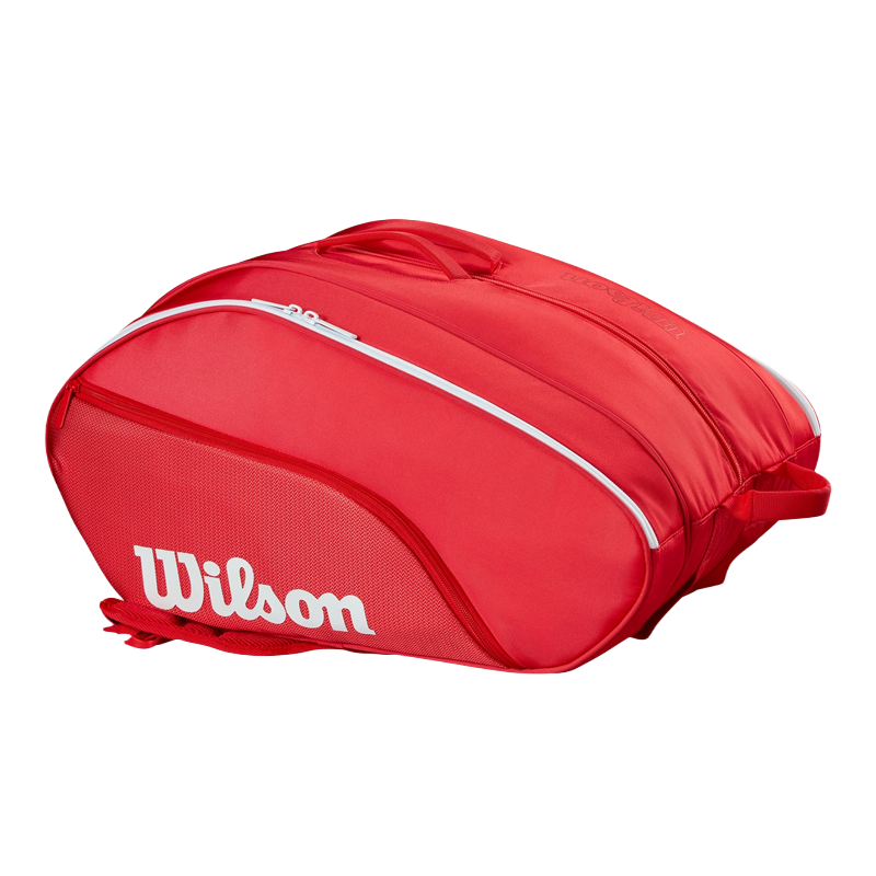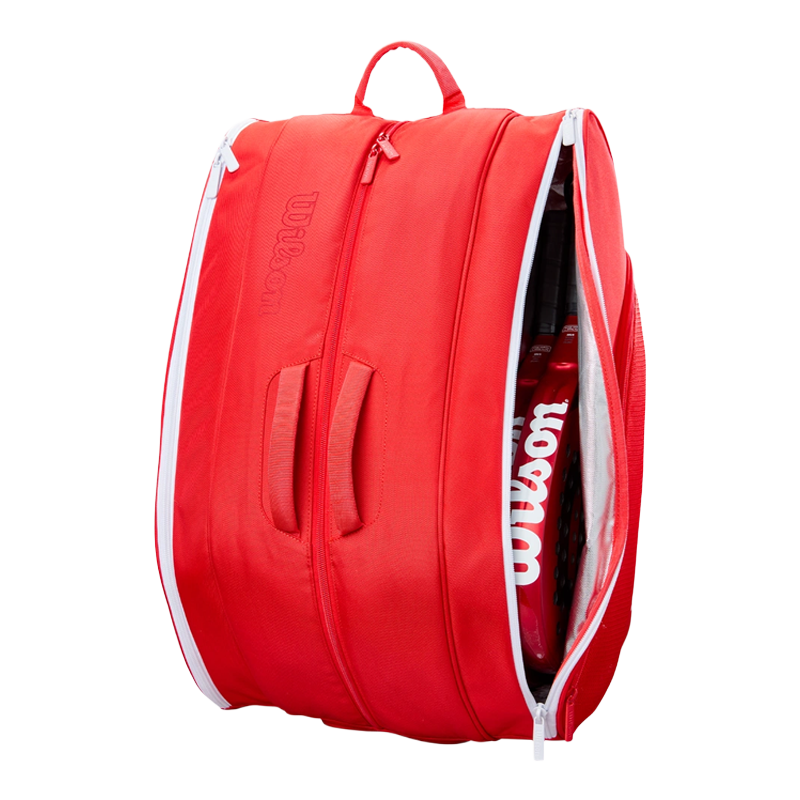 Padel bag Wilson Red Tour, it has two main compartments for 6 rackets, it has several extra pockets for other accessories, it is lined with Thermoguard that protects the rackets from extreme temperatures.