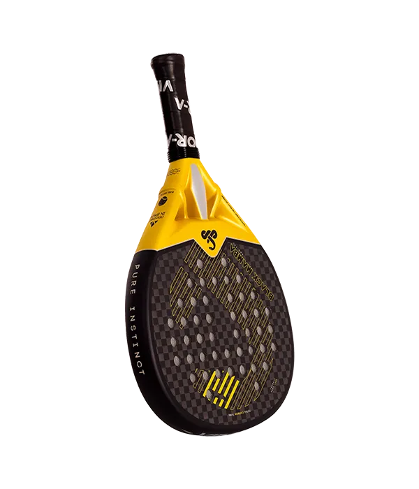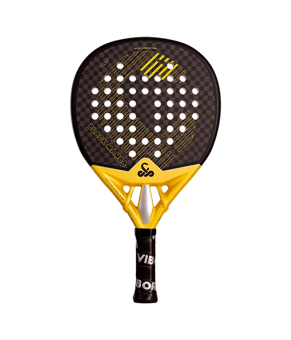 Racket VIBOR-A Black Mamba Radical 12K 2.0 with the bridge and the logo appear in a golden yellow tone that harmonizes perfectly with the dark nuances of the carbon and the black and gray frame. The technical specifications remain similar to the previous model, preserving the carbon 12K, Mid balance and laminated EVA core. However, the finish changes, replacing the rough shine with a smooth matte