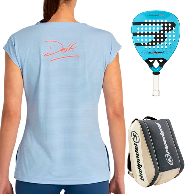 The official t-shirt Bullpadel Delphi Blue Celeste Women, designed for the player Delfi Brea, combines performance and style. With short sleeves and seamless armholes, it offers maximum comfort and freedom of movement. Its single fabric with nylon and elastane provides a flexible fit, while the Drylum finish ensures quick drying, keeping you fresh in every match. In addition, its gel details and the player's logo with her racket They enhance the exclusive design, ideal for those looking for professional quality and comfort on the court.