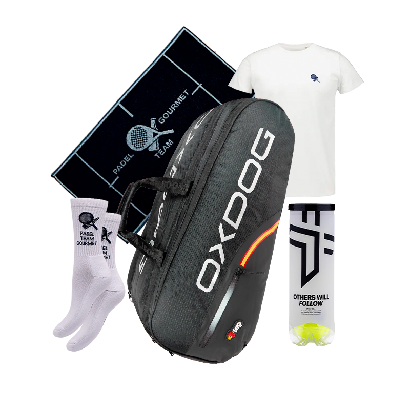 Pack Padel Team Gourmet for lovers of padel and post-padel. A pack that includes an Oxdo FEP padel bag, a white t-shirt, a towel and white socks Padel Team Gourmet as well as some balls Oxdog BOOST+.