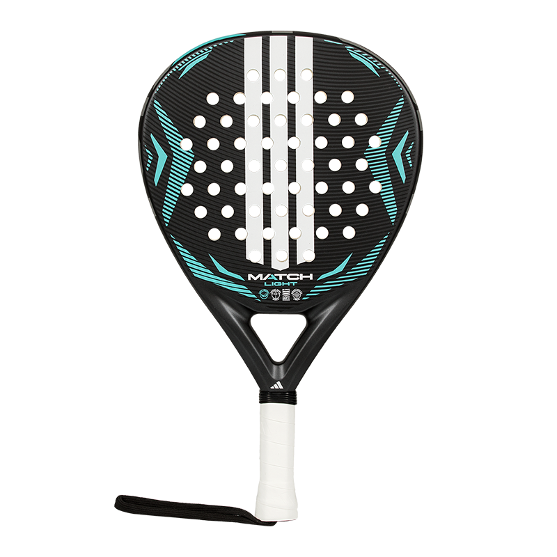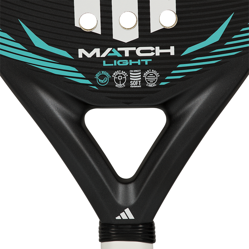 Racket Adidas Match Light 2026: designed to start in padel with versatility. Lightweight fiberglass structure (345-360 gr) with Soft Performance EVA rubber that guarantees comfort and excellent ball output. Hybrid all-round format balances offensive and defensive hits. Perimeter reinforcements and Smart Holes Linear optimize durability and power. Medium balance ideal for players in the discovery phase looking for maneuverability without sacrificing performance.