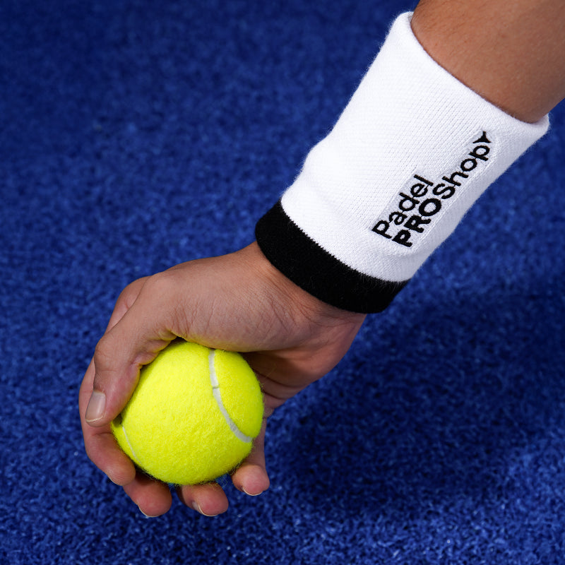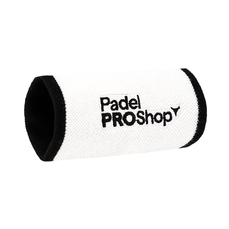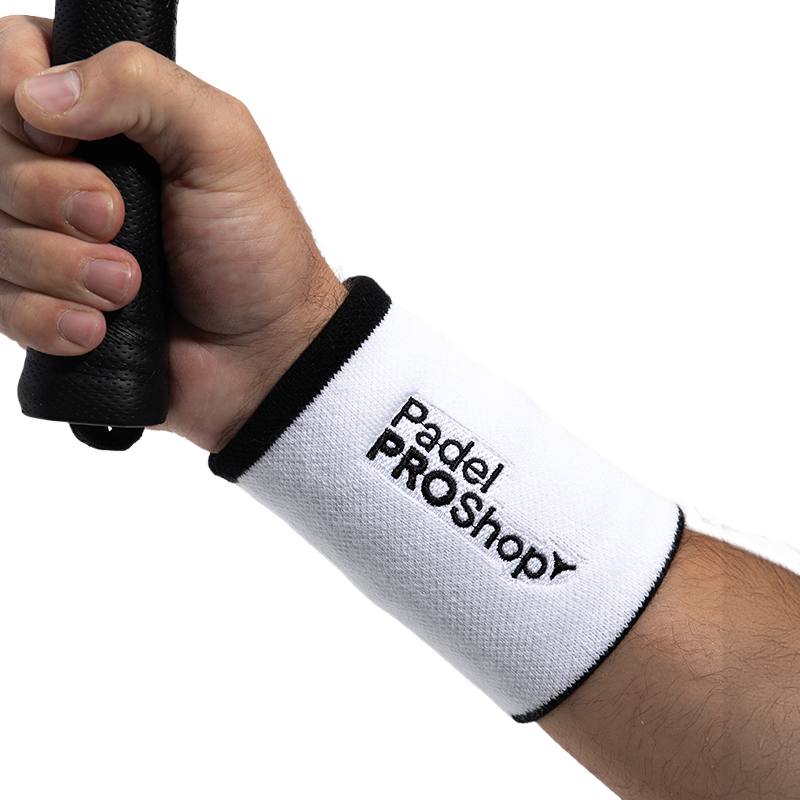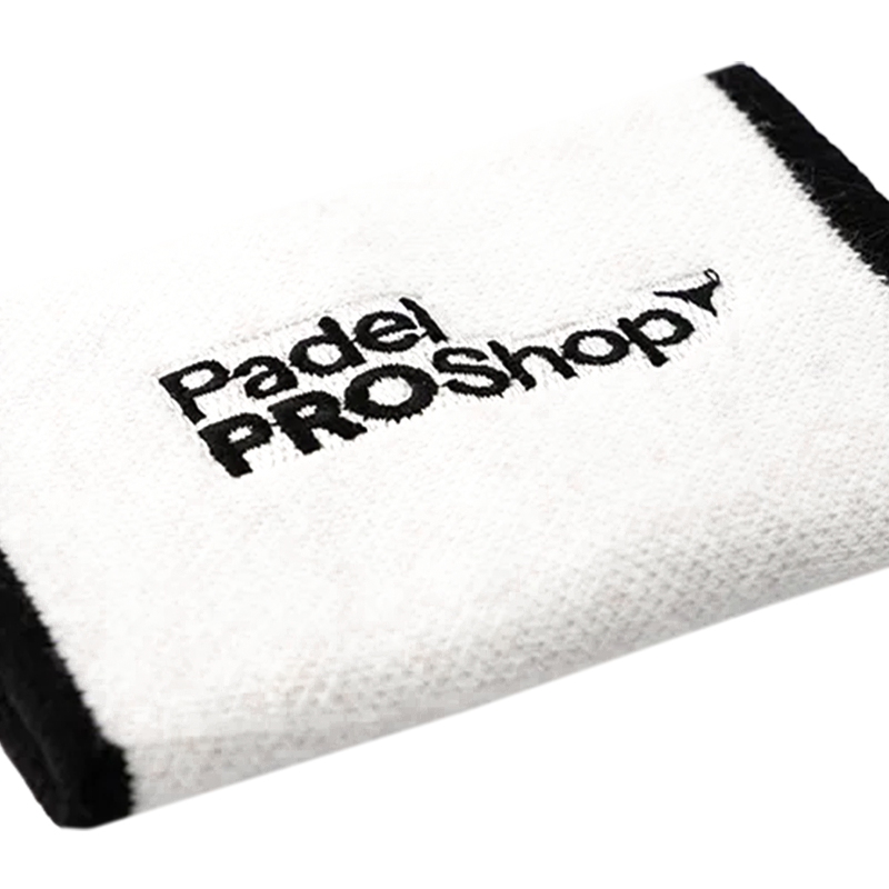 Long Wristband PadelPROShop in color White with Logo PadelProEmbroidery shop. A comfortable wristband that quickly and easily absorbs sweat during sports practice. Made of 80% cotton, 12% spandex and 8% polyester.