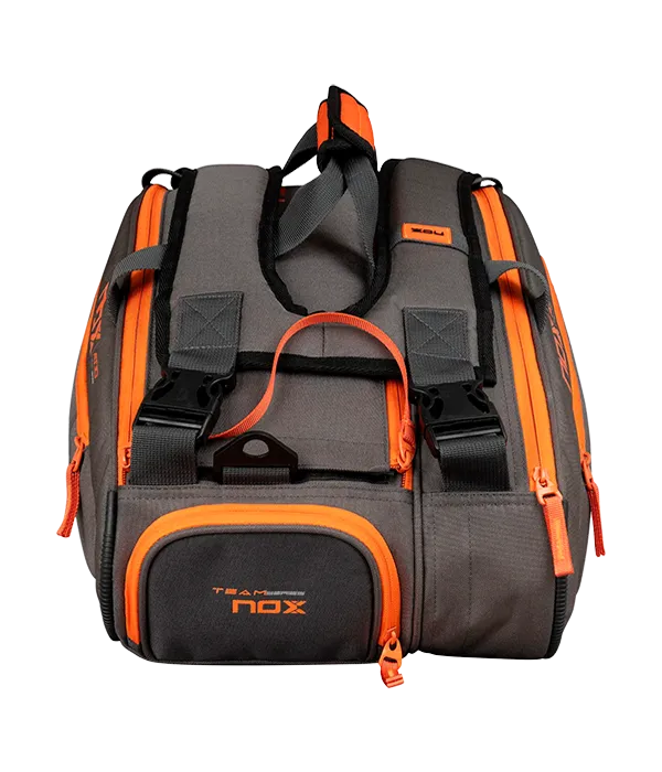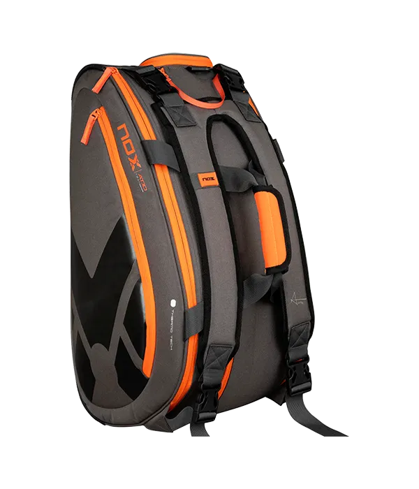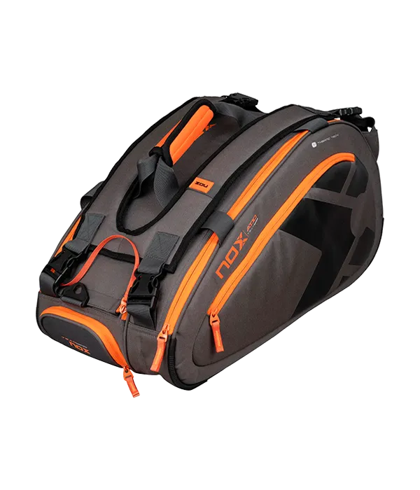 Padel bag NOX AT10 team Gray/Orange 2024, the model designed for Agustín Tapia. The compartment main double zipper for easy access to the interior with capacity has a capacity for 3 paddles padel, clothes, etc. In addition, it has another thermal compartment with capacity for 2 paddles. padel as well as one more for sneakers.