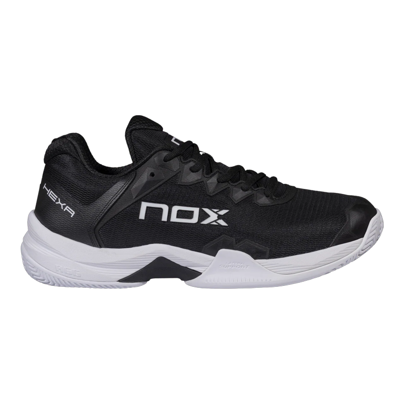 The Padel Shoes Nox ML10 HEXA in color Black and White, model that inherits the characteristic agility of the HEXA line with a more robust and comfortable construction. These slippers padel Nox They incorporate improved materials that offer absolute comfort from the first game and a support that locks the foot securely during turns and sudden braking. The implementation of new reinforced compounds guarantees greater durability, optimally resisting continuous friction with the track.