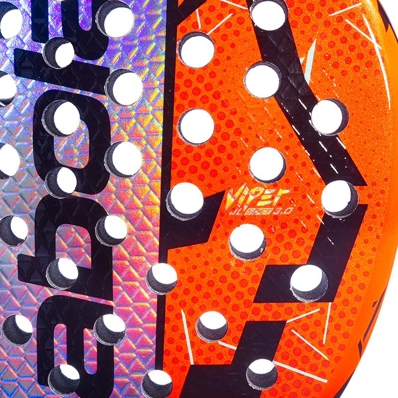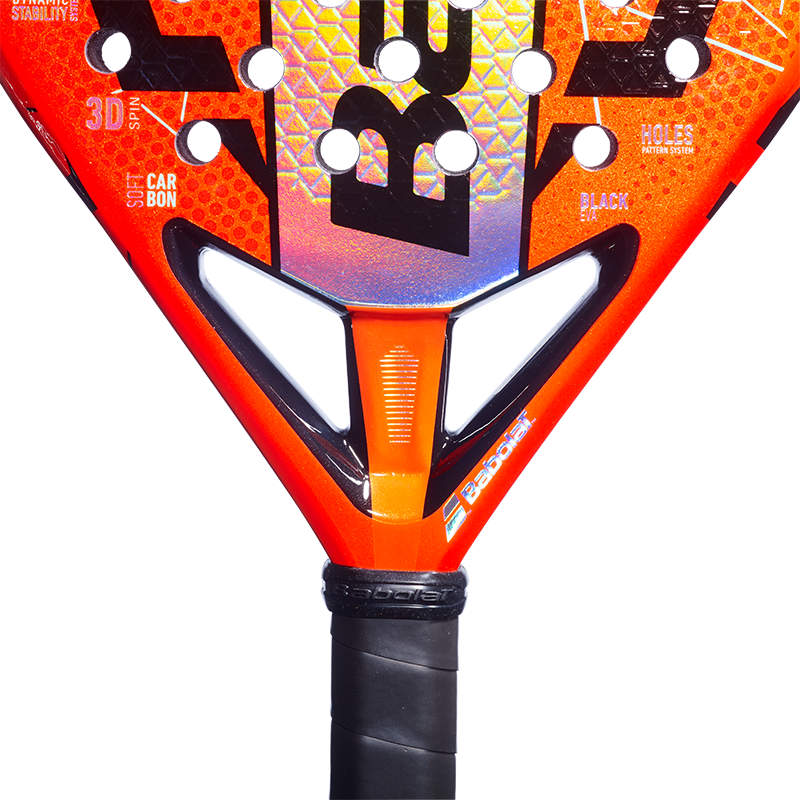 The friendlier hitting surface thanks to the incorporated twill carbon allows for a less demanding touch, while the HPS (Holes Pattern System) optimizes the distribution and size of the holes according to the shape of the racket to increase power transmission and precision when returning blows. The technology 3D Spin incorporates reliefs on the surface of the racket to increase the effects of the ball, and the exclusive design of the heart of the ball racket, With its reinforced central bar, it improves stability and provides greater power and greater ball control.