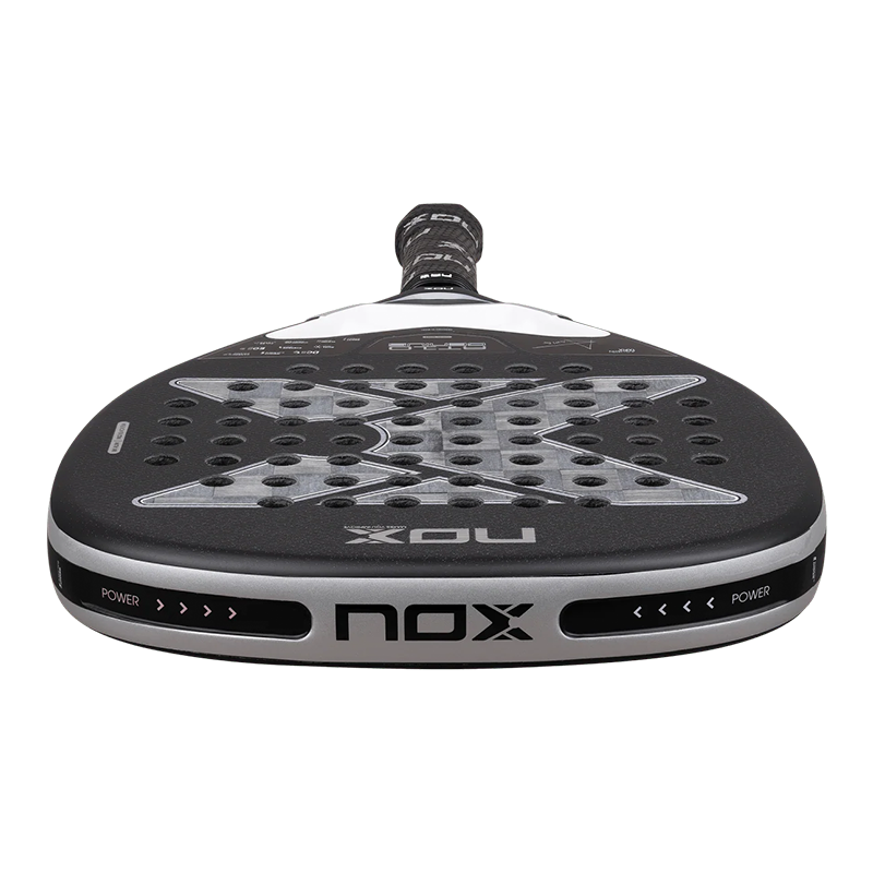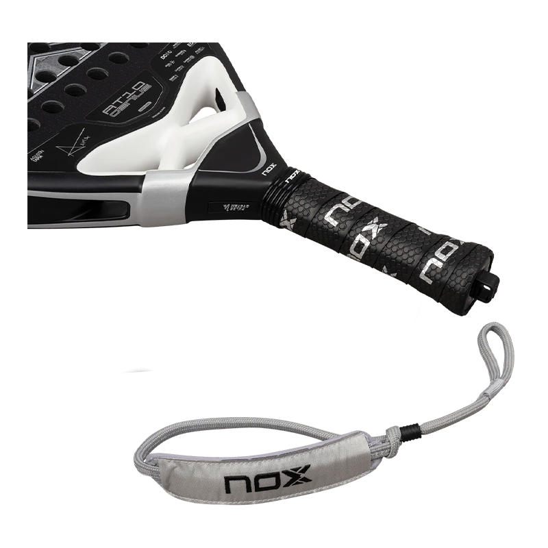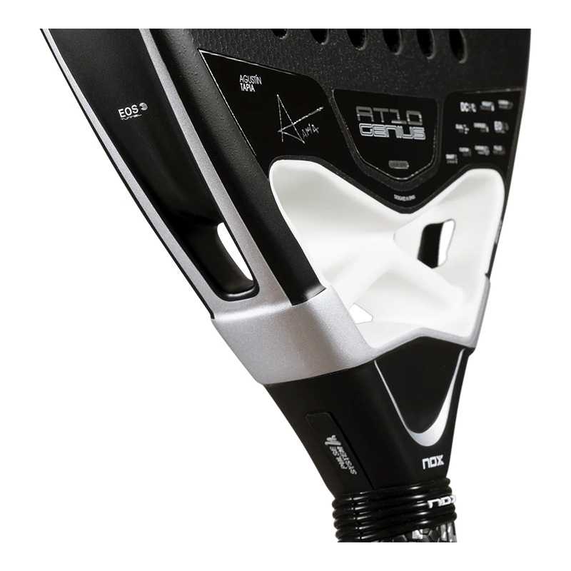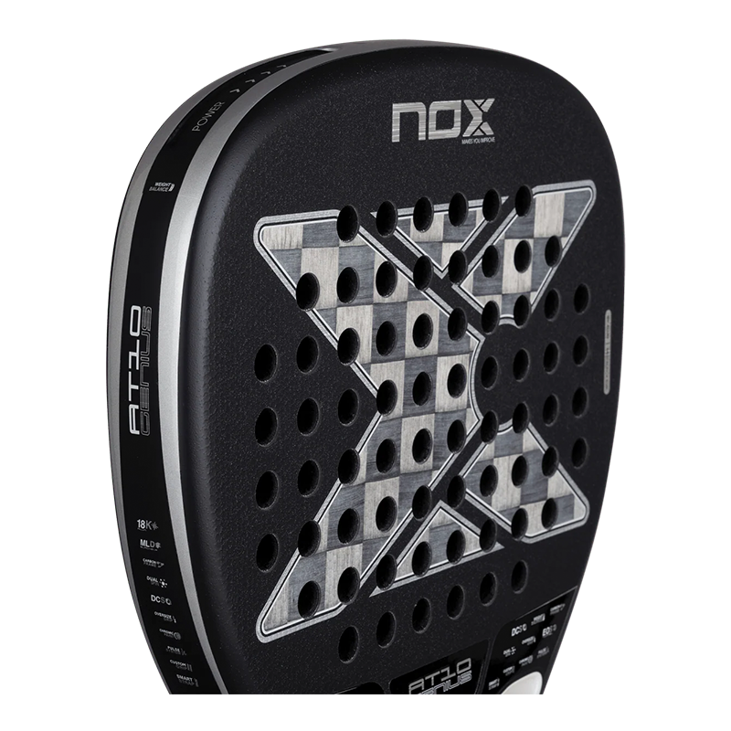 The new Racket Nox AT10 Genius Attack 18K Alum 2026, designed for offensive players, offers maximum power without sacrificing precision. Its diamond format, high balance and extended fist facilitate total dominance in the attack. It incorporates the innovative Weight Balance system to customize the balance according to your style, along with the exclusive Chromic Paint that changes color with light and the Dual Spin surface to enhance the effects. Its carbon structure 18K aluminized and the MLD Black Eva core provide a solid, comfortable feel and optimal performance on the court. This racket cocarbon blend 18K aluminized for a solid and uniform feel with a multi-layer MLD Black EVA core that optimizes power and control in each shot.