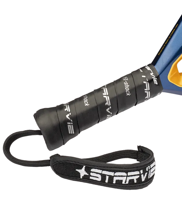 The racket StarVie Drax+ 2026, with its teardrop shape, is designed for versatile players looking for precision and balance. Its surface in 12K Carbon Hyper widens the sweet spot, offering a more reactive feel. The rubber M-Eva Balance of medium-hard density ensures optimal control and power, adapting to different situations. In addition, it incorporates Shock Shield in the frame to improve stability and balance, while the Z-Shock in the grip absorbs vibrations, providing greater comfort with each blow.