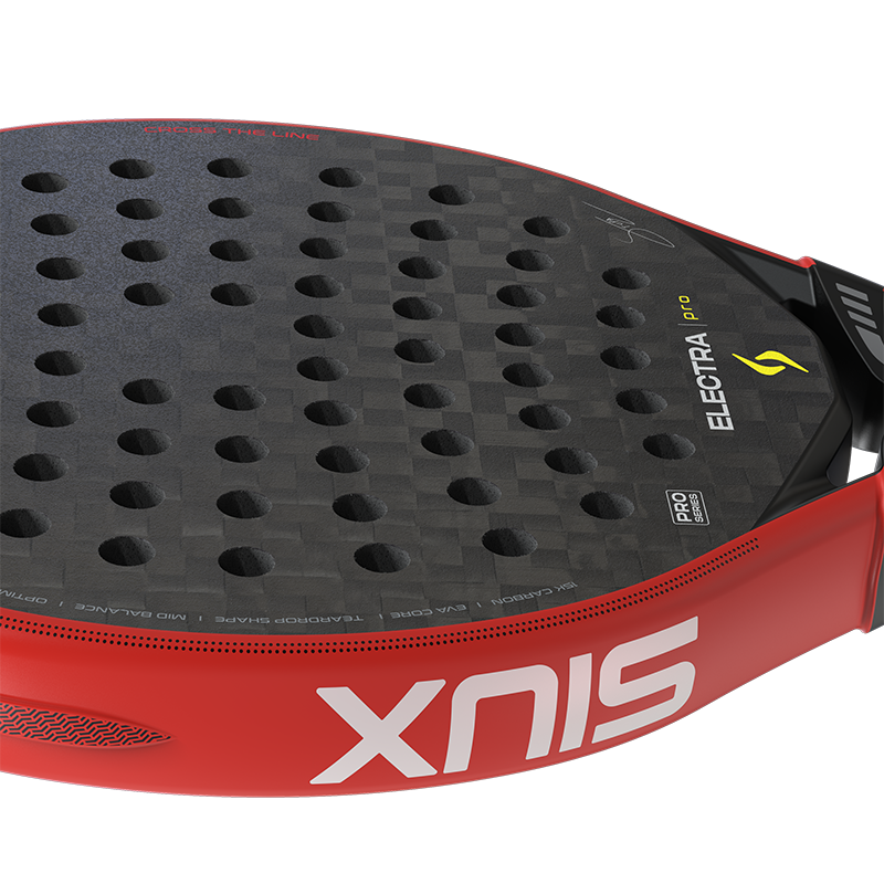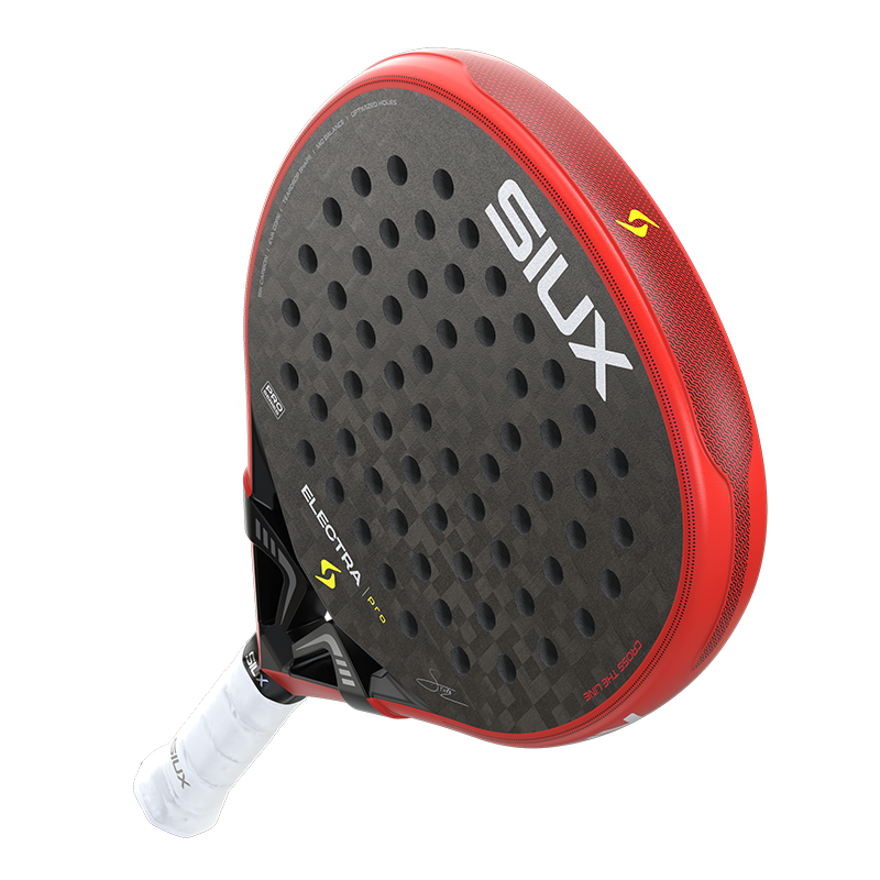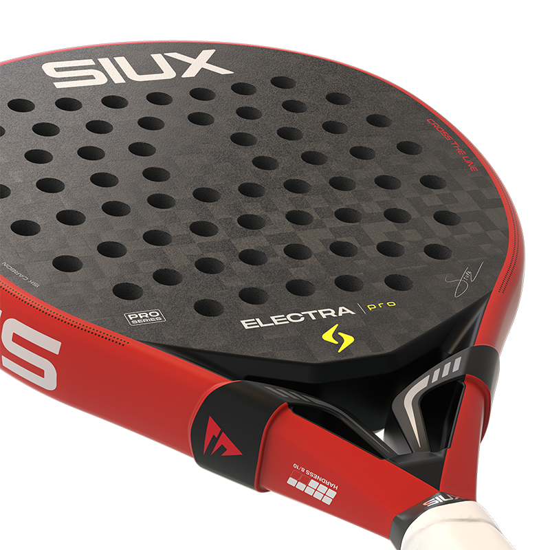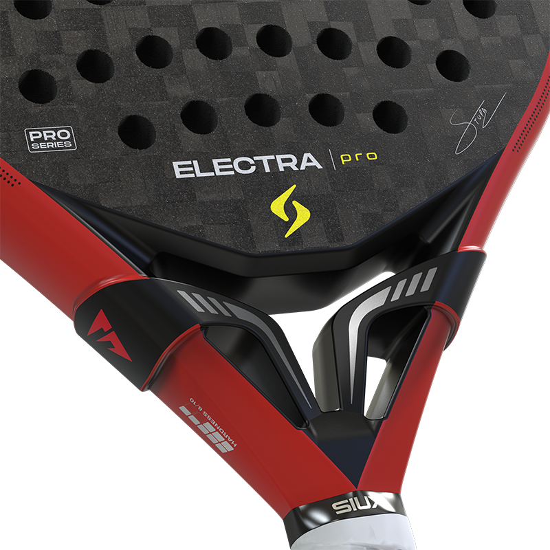 The Siux Electra Pro Fire Red 2026 redefines the concept of racket hybrid for the professional player looking for absolute versatility. Designed in a teardrop shape, this racket It integrates the explosive power that attacking players demand. Its construction incorporates carbon faces 12K which provide rigidity, while the EVA core guarantees controlled absorption that translates strength into precision. The sandy matte finish is not an aesthetic detail: it is technology applied to maximize the effect of each shot.