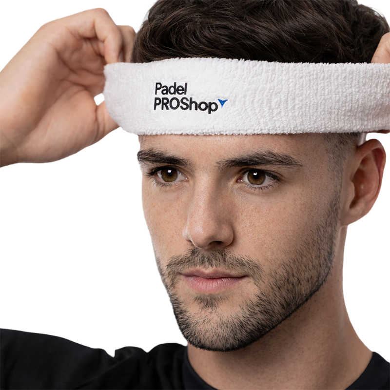 Cinta PadelPROShop en color blanca para pelo. Un accesorio perfecto para ofrecer la máxima comodidad durante cualquier actividad deportiva. Logo bordado de PadelPROShop fabricada 80% algodón, 12% spandex, 8% poliéster.
