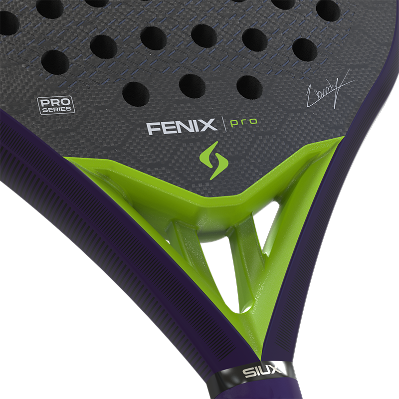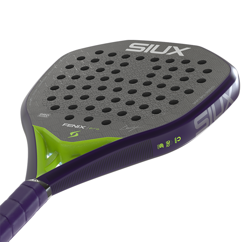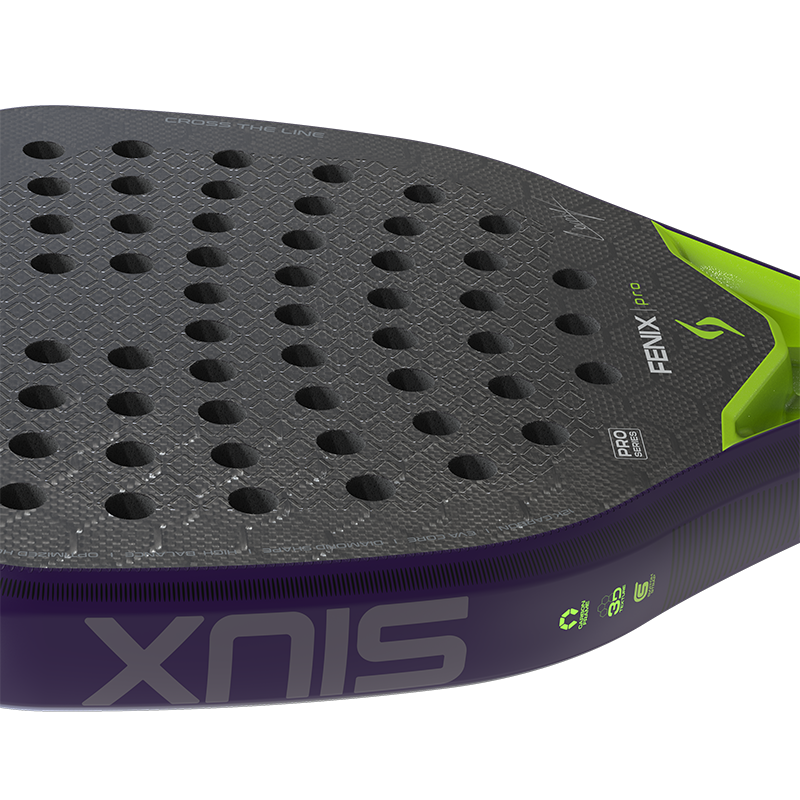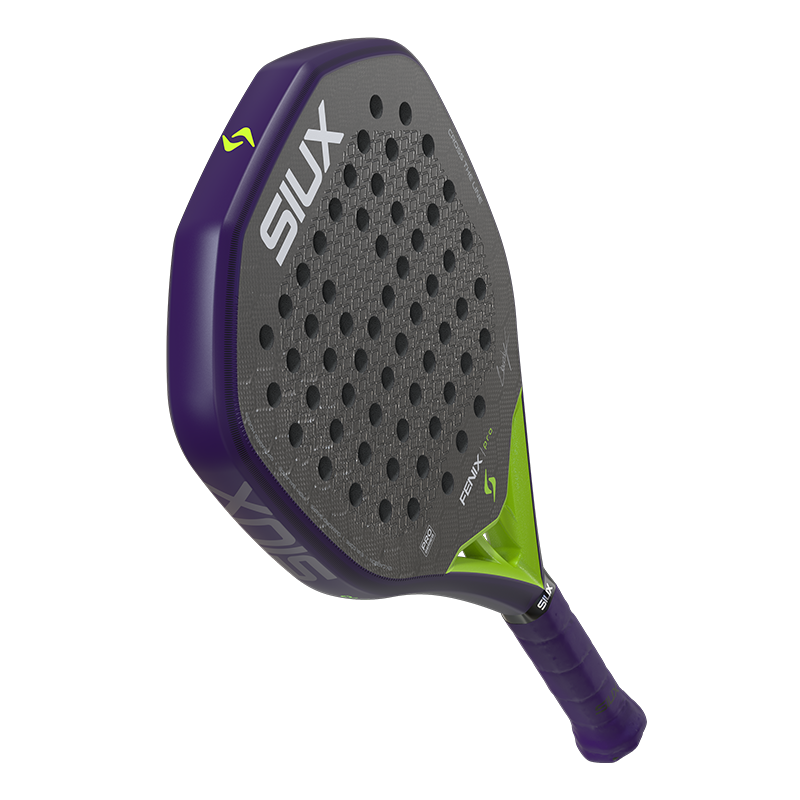 La Siux Fenix Pro Glow Purple 2026, la pala de Leo Ausburger, es una pala de potencia pura diseñada para el jugador profesional de ataque. Su forma diamante concentra la masa en la zona alta, generando aceleración máxima en cada remate. Las caras de carbono 12K transmiten energía sin pérdidas, mientras el núcleo de EVA proporciona la rigidez necesaria para golpes explosivos.