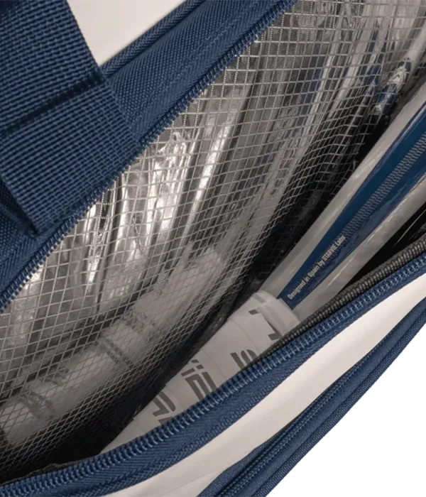 El paletero StarVie Tactic Pro Blanco 2026 ofrece una capacidad excepcional para jugadores que exigen organización y protección avanzada. Sus dos compartimentos térmicos Termotech garantizan el cuidado óptimo de tus palas ante cambios de temperatura. Cuenta con un espacio ventilado exclusivo para calzado, manteniéndolo fresco y seco, y un bolsillo individual para tener tus bolas siempre accesibles. Su diseño moderno en blanco, azul marino y detalles naranjas aporta estilo y funcionalidad en cada partido. Ideal para quienes buscan rendimiento y comodidad profesional en una sola bolsa.
