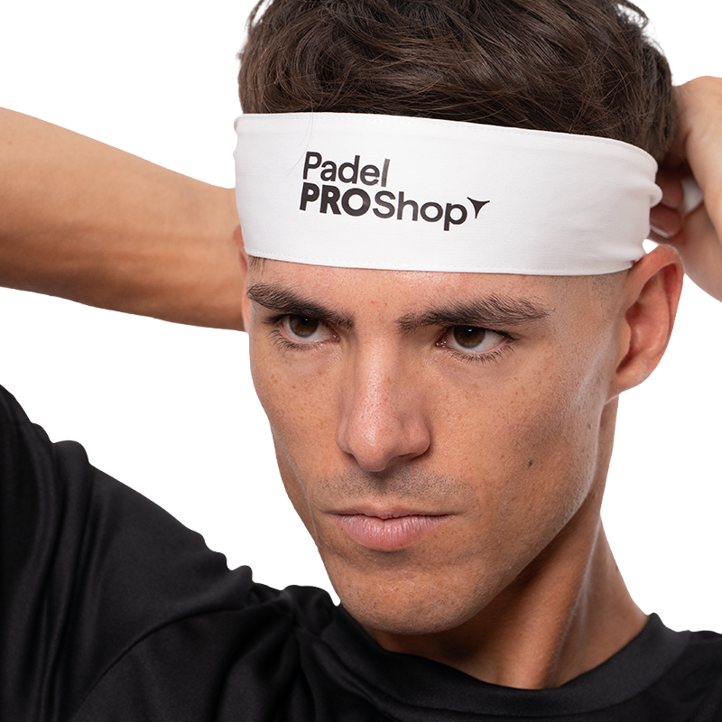 Bandana PadelPROShop Blanca ajustable gracias a su extensión. Olvídate de molestias durante el juego con esta bandana de PadelPROShop fabricada 100% en poliéster.