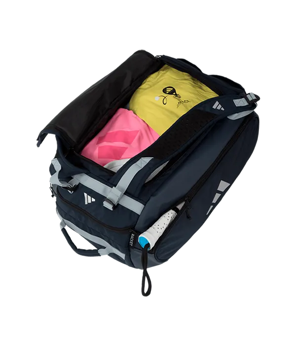 Paletero Adidas Tour azul marino con un amplio compartimento central con cremallera para almacenar ropa y equipamiento. Integra dos bolsillos laterales con protección thermo para proteger hasta dos palas en cada lado. Además, esta mochila incluye un bolsillo inferior ventilado para calzado. La mochila está equipada con dos correas de malla acolchada ajustables.