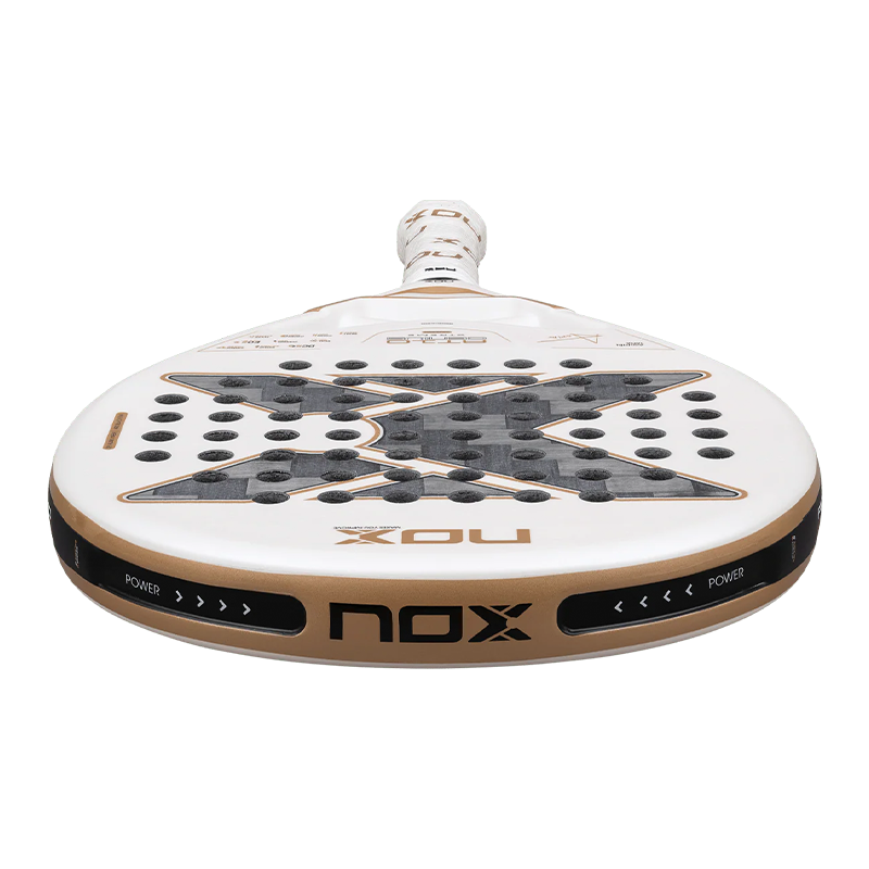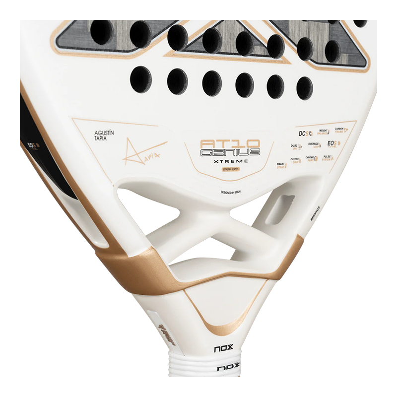La Pala Nox AT10 Genius 12K Alum Xtrem by Agustín Tapia 2026 ofrece un tacto sólido que equilibra potencia y control, ideal para jugadores exigentes. Presenta el sistema Weight Balance para ajustar el balance a tu estilo, pintura Chromic Paint que reacciona al juego y superficie Dual Spin para maximizar efectos. Fabricada con carbono 12K Alum Xtrem, garantiza rigidez, durabilidad y un rendimiento constante incluso ante cambios de temperatura. Una pala diseñada para optimizar cada golpe con precisión y estabilidad. Gracias al carbono 12K mejora rigidez y durabilidad. Su núcleo HR3 Black EVA para potencia y memoria óptima, y sistema Weight Balance para personalizar peso y balance, garantizando un rendimiento adaptado y constante. Además, combina dos técnicas de superficie rugosa, con textura 3D y acabado arenado que amplia los golpes con efecto. La tecnología EOS Tunnel con perforaciones laterales mejoran la aerodinámica y manejabilidad, ofreciendo mayor agilidad y precisión en cada golpe.