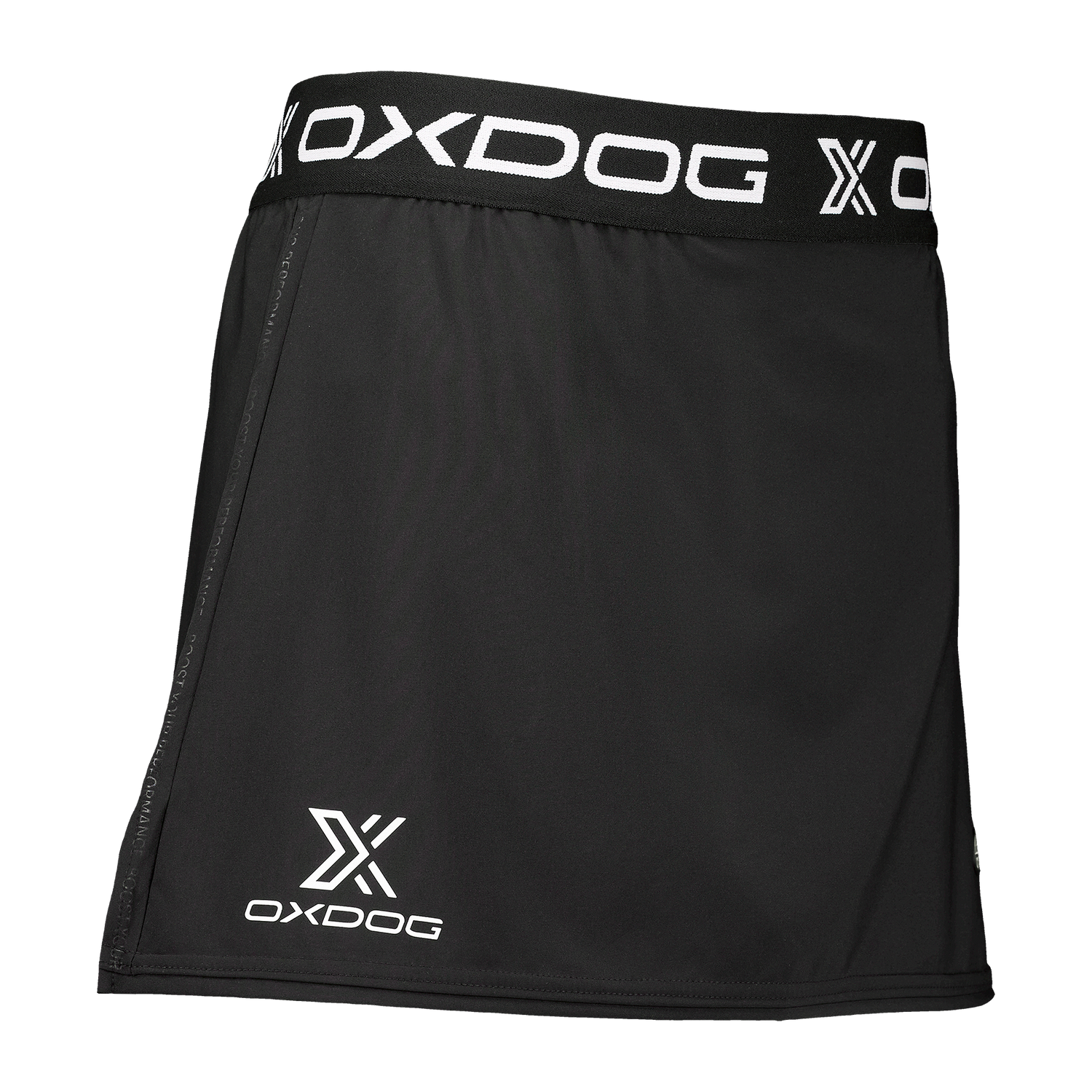 Falda técnica ligera Oxdog de secado rápido en color negro con logotipos de Oxdog. Cinturilla de goma elástica para una mayor comodidad de la jugadora.