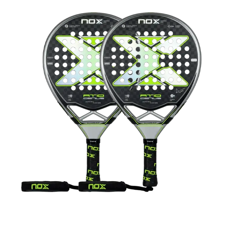 Pack de dos palas NOX AT10 Genius 12K Limited Edition Agustín Tapia, una reedición de la pala del genio de Catamarca. Una pala con un núcleo HR3 y marcos 100%carbono.  La superficie rugosa te ayudará en los golpes con efecto y el agarre de la bola. Mejora la higiene y la seguridad de tu pala reemplazando fácilmente el cordón sin perder la garantía al no tener que manipular el tapón inferior.