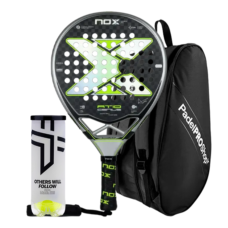 Pack de pala NOX AT10 Genius 12K Limited Edition Agustín Tapia, paletero negro  PadelPROShop y pelotas Oxdog. Esta pala es  una reedición de la pala del genio de Catamarca. Una pala con un núcleo HR3 y marcos 100%carbono.  La superficie rugosa te ayudará en los golpes con efecto y el agarre de la bola. Mejora la higiene y la seguridad de tu pala reemplazando fácilmente el cordón sin perder la garantía al no tener que manipular el tapón inferior.