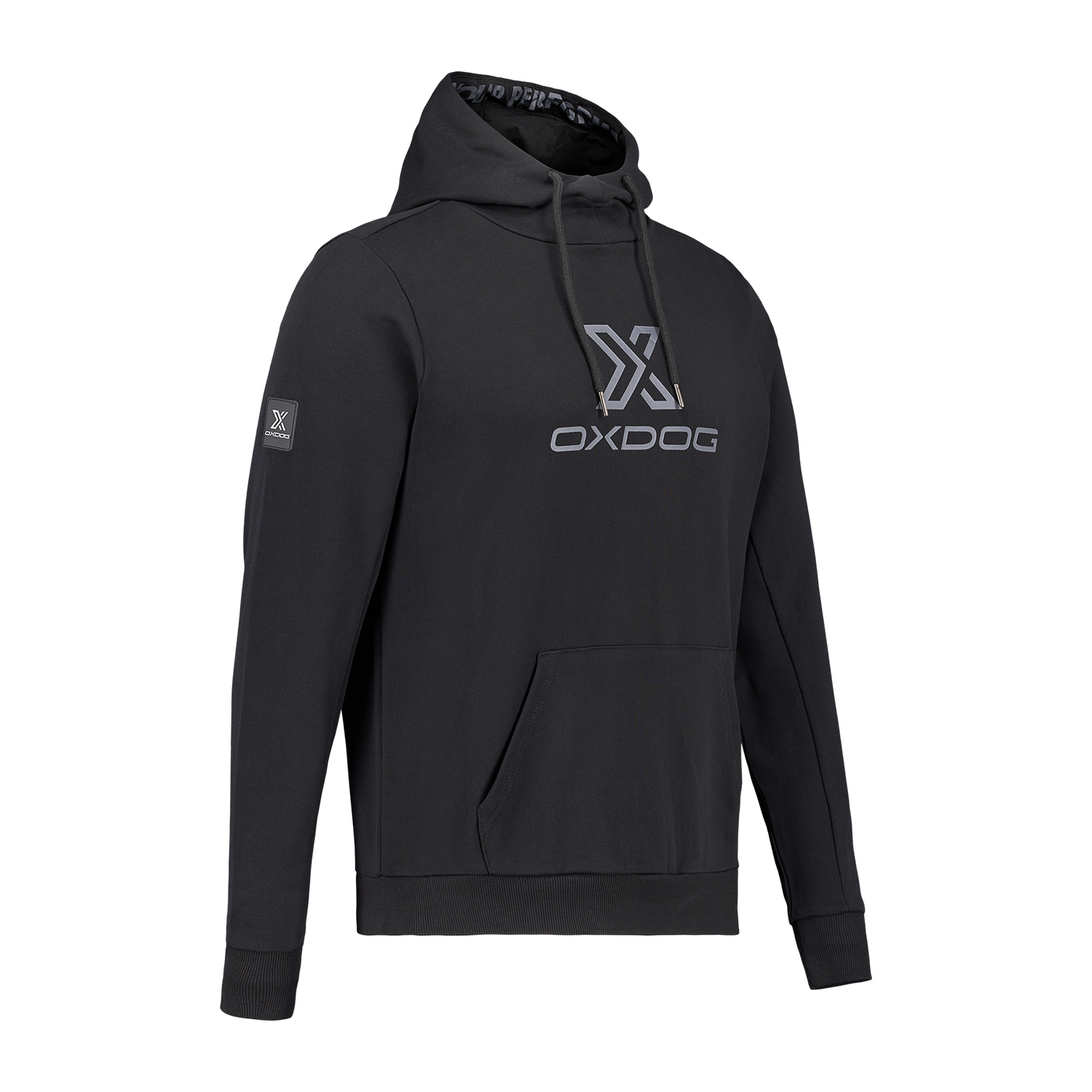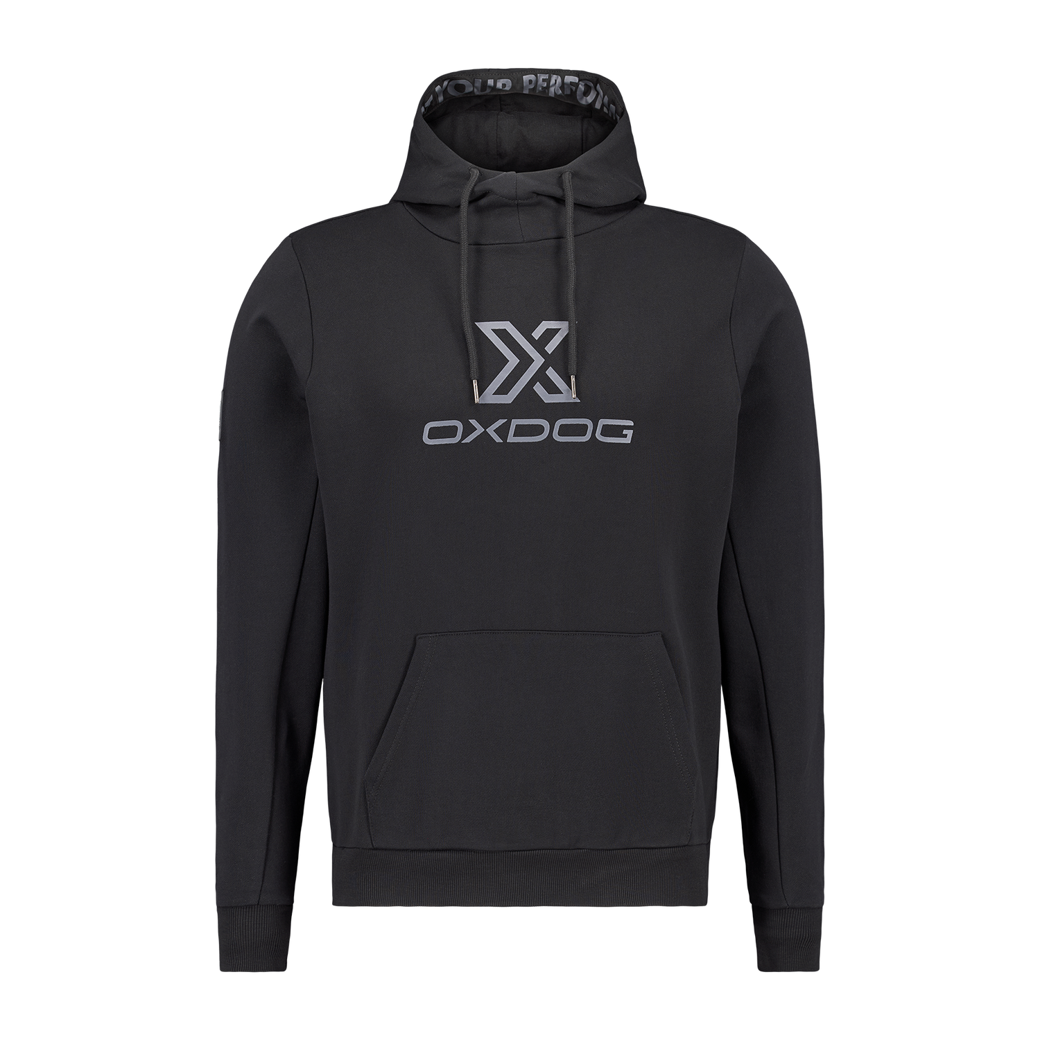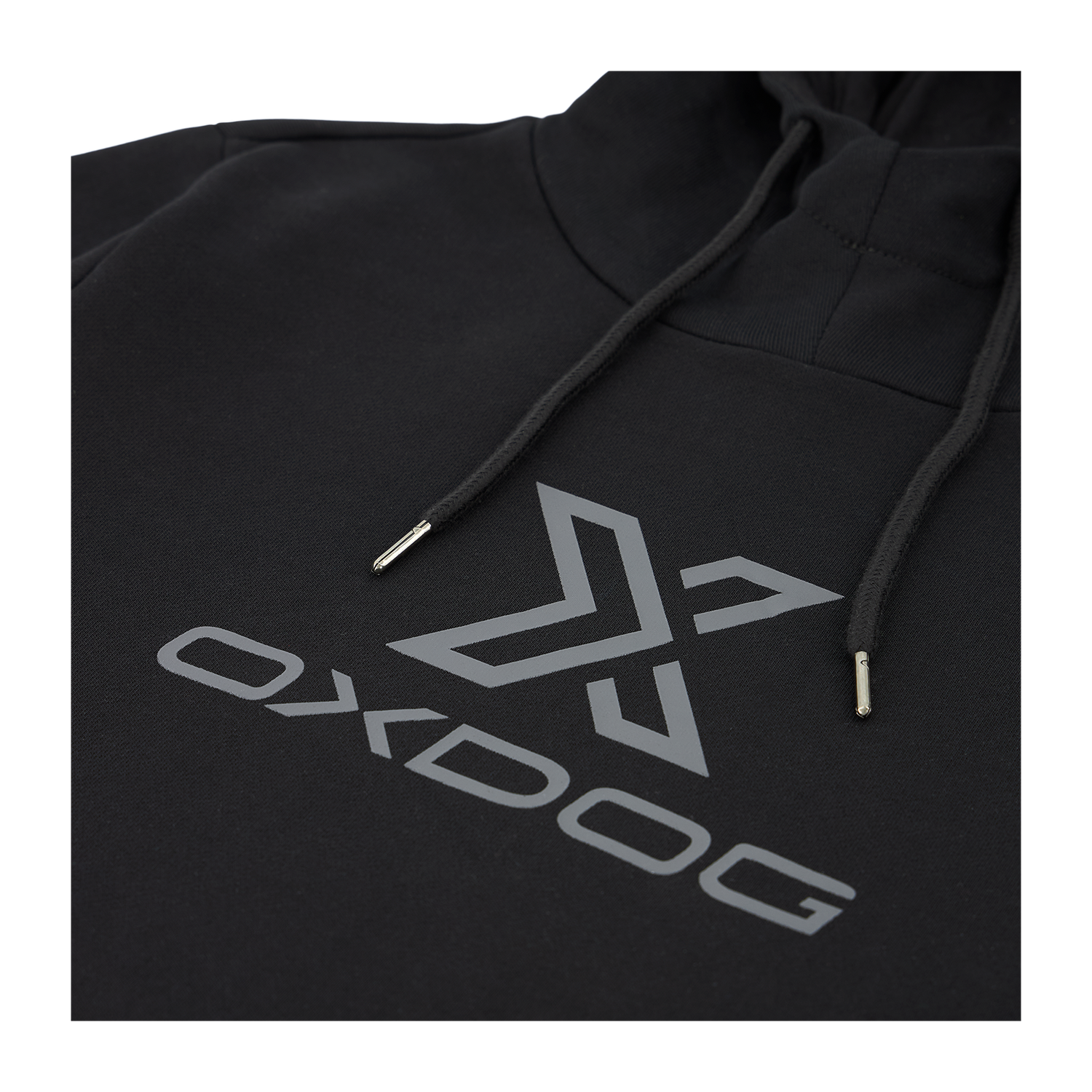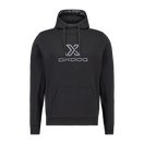 Sudadera de la marca Oxdog en color negro con capucha. La prenda incluye cordones ajustables y un bolsillo central. También incorpora detalles en la capucha y en el pecho de la sudadera.