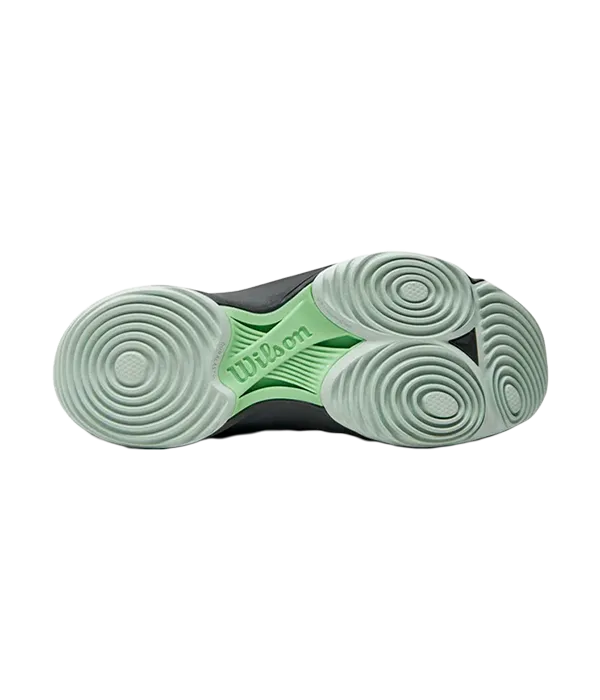 Zapatillas Wilson Hurakn Pro en color negro y verde para mujer con construcción de calcetín interior. Su suela garantiza un óptimo agarre gracias a una suela exterior reforzada en antepié y talón. La espuma OrthoLite de alta densidad ofrece acolchado máximo y longevidad impresionante. La entresuela de EVA integra material de hilo de plástico reciclado para ofrecer una excelente capacidad de respuesta