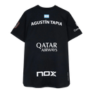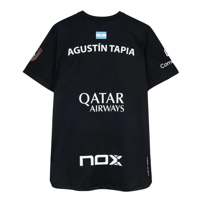 La camiseta oficial NOX Sponsors AT10 Black es la réplica exacta utilizada por Agustín Tapia en el circuito profesional, diseñada para ofrecer máximo rendimiento técnico.