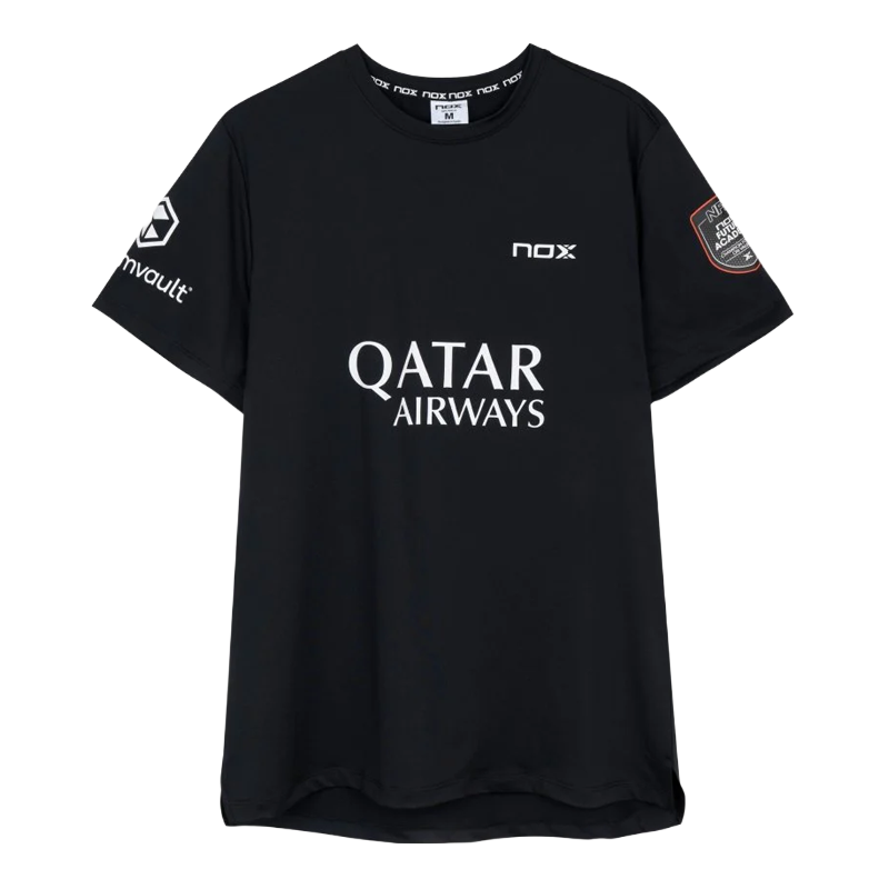 Esta camiseta técnica incorpora los sponsors oficiales actualizados de Agustín Tapia: Qatar Airways, Commvault y NFA (Nox Future Academy), combinando funcionalidad de alto nivel con un diseño profesional.