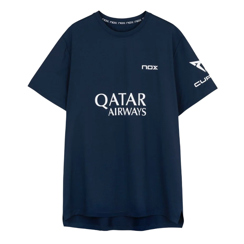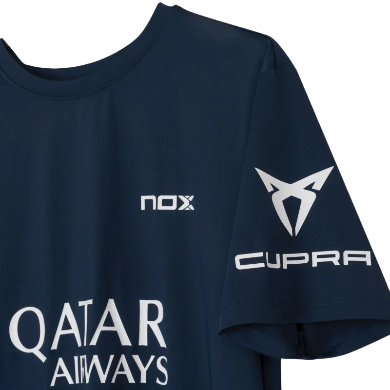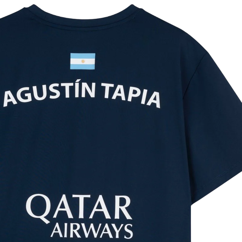 Esta camiseta técnica incorpora los sponsors oficiales de Agustín Tapia: Qatar Airways, Commvault y la NFA (Nox Future Academy), combinando funcionalidad de alto nivel con un diseño elegante y sobrio.