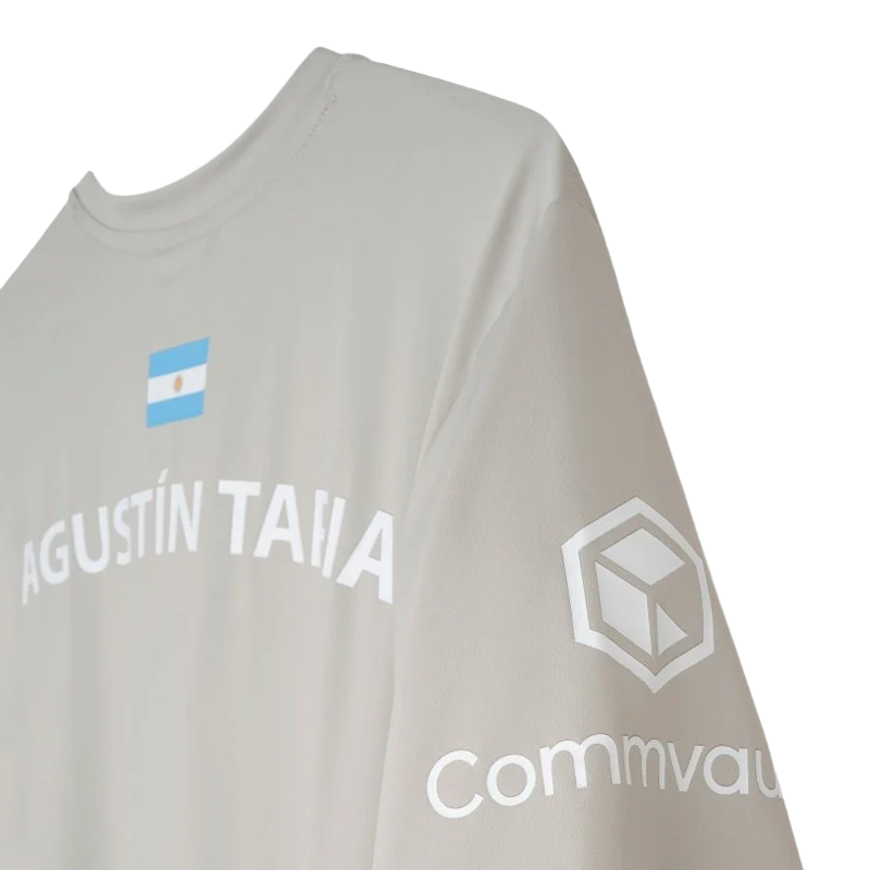 Esta versión en tonalidad Light Grey incorpora los sponsors oficiales de Agustín Tapia: Qatar Airways, Commvault y NFA (Nox Future Academy), combinando funcionalidad de alto nivel con un diseño profesional equilibrado.