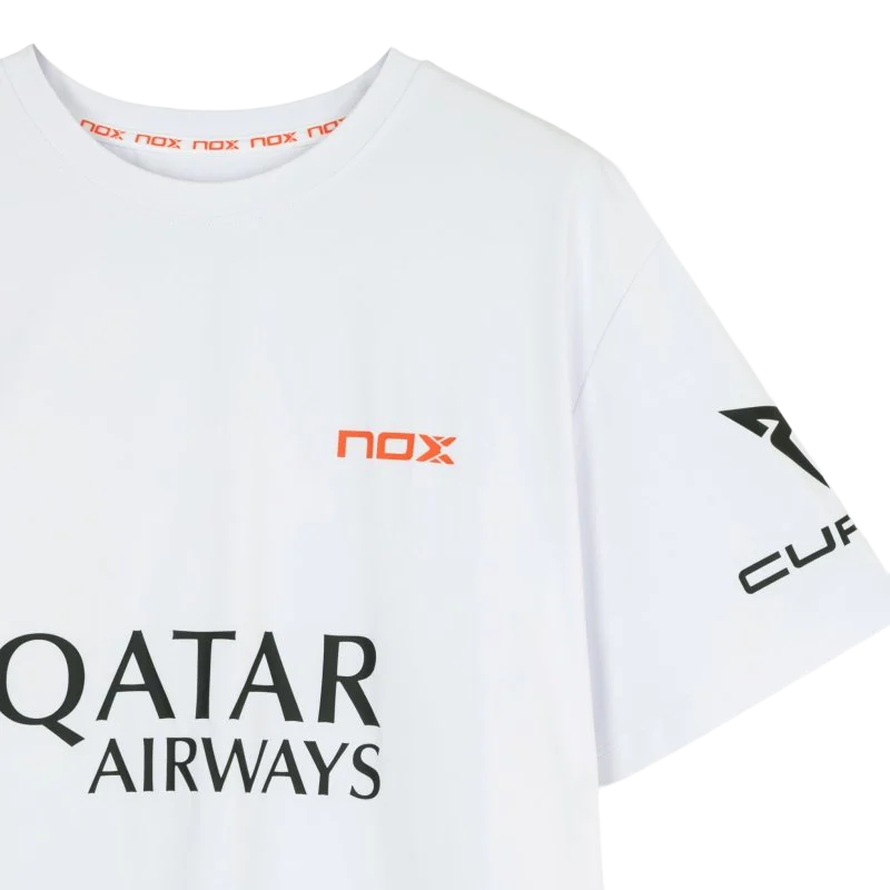 Esta versión blanca incorpora los sponsors oficiales actualizados de Agustín Tapia: Qatar Airways, Commvault y NFA (Nox Future Academy), combinando funcionalidad de alto nivel con un diseño profesional nítido.