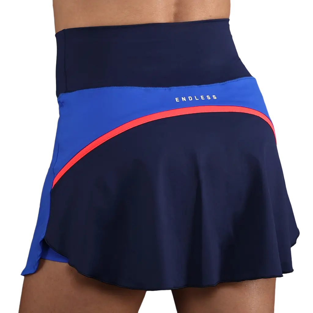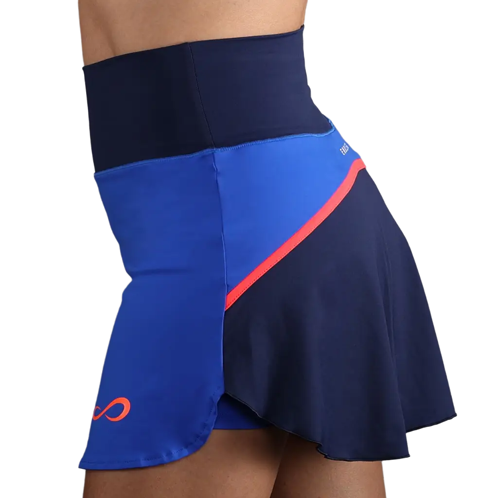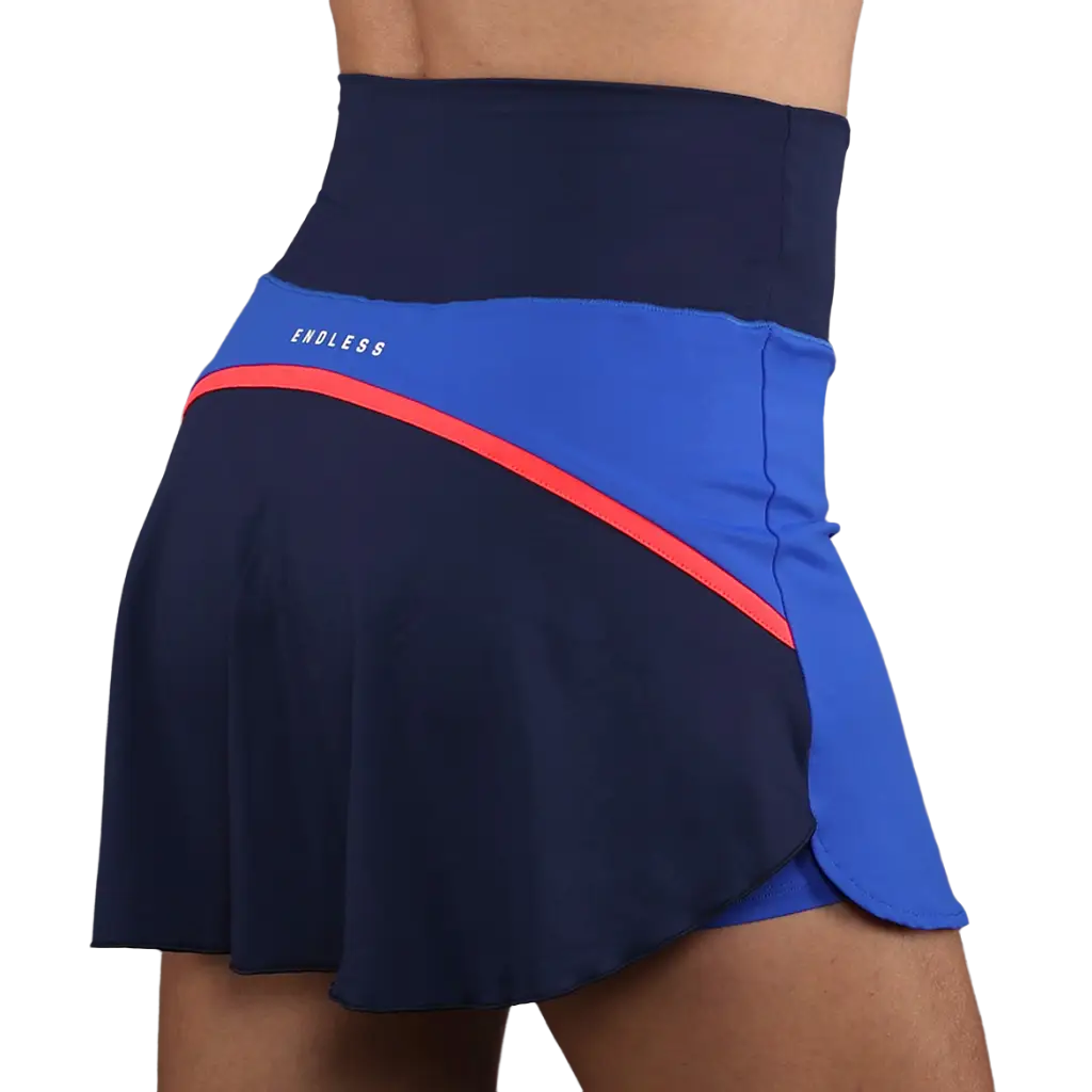 Falda Endless Bloom azul diseñada para mujeres que buscan rendimiento y estilo en pádel. Tejido extra-elástico con 80% poliamida y 20% Lycra® ofrece libertad de movimiento en todas direcciones. Short interior anatómico proporciona sujeción y facilita guardar la pelota. Tecnología multifilamento absorbe humedad y seca rápidamente, mientras que la protección solar UPF 50+ resguarda tu piel durante entrenamientos y competiciones.