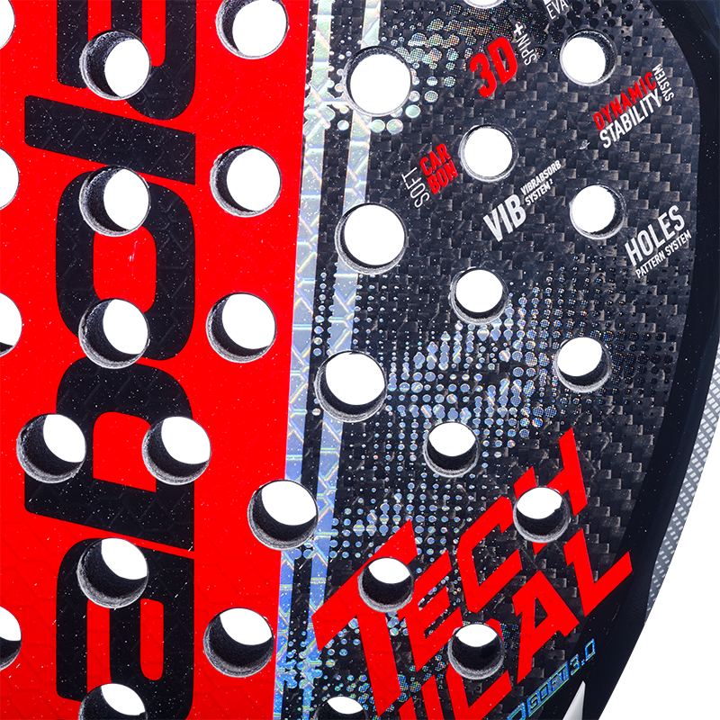 Optimiza la absorción de vibraciones gracias a una combinación específica de elastómeros integrados estratégicamente en las fibras de carbono, tanto en el corazón como en el mango de la pala. Este diseño reduce significativamente las vibraciones generadas en cada golpe, ofreciendo mayor confort y ayudando a minimizar el riesgo de lesiones.