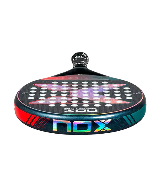 Pala NOX Equation Light W Advanced 2025 destinada a jugadores de nivel intermedio. Una pala con un balance medio, marco de carbono y sistema de antivibraciones para proteger a los jugadores de lesiones. . La rugosidad de sus caras conseguida a base de láminas transparentes 3D ayudarán a los jugadores a dar mayores efectos a sus golpes.