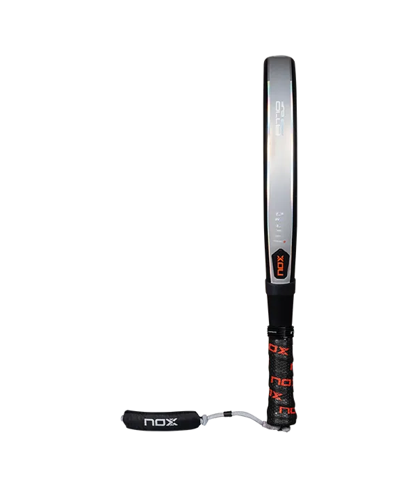 Pala NOX AT10 Pro Cup Hard 2025 Agustín Tapia, fabricada en una combinación de fibra de vidrio con un acabado metalizado y núcleo EV50 ofreciendo una sensación de golpeo con un tacto sólido y dureza intermedia.