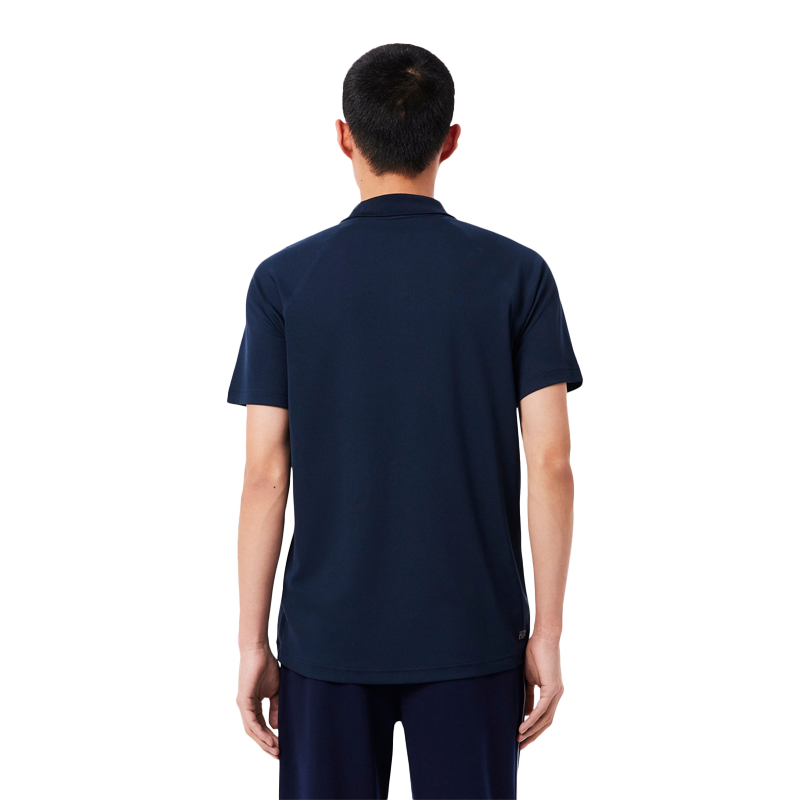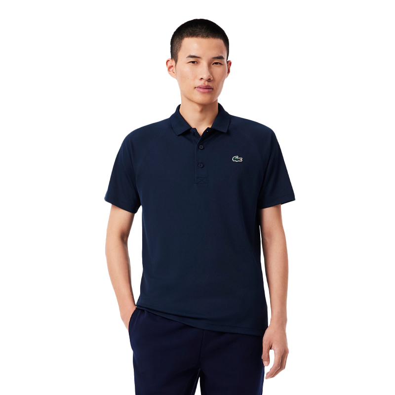 Polo Lacoste de corte regular en azul marino, concebido para el tenis con precisión técnica. Su tejido piqué interlock de poliéster antidesgarro resiste los movimientos más exigentes, mientras que la tecnología Ultra Dry mantiene la comodidad durante el juego. Diseño clásico con cuello acanalado de tres botones, mangas raglán y el icónico cocodrilo verde bordado en el pecho. Herencia de excelencia deportiva desde 1933.