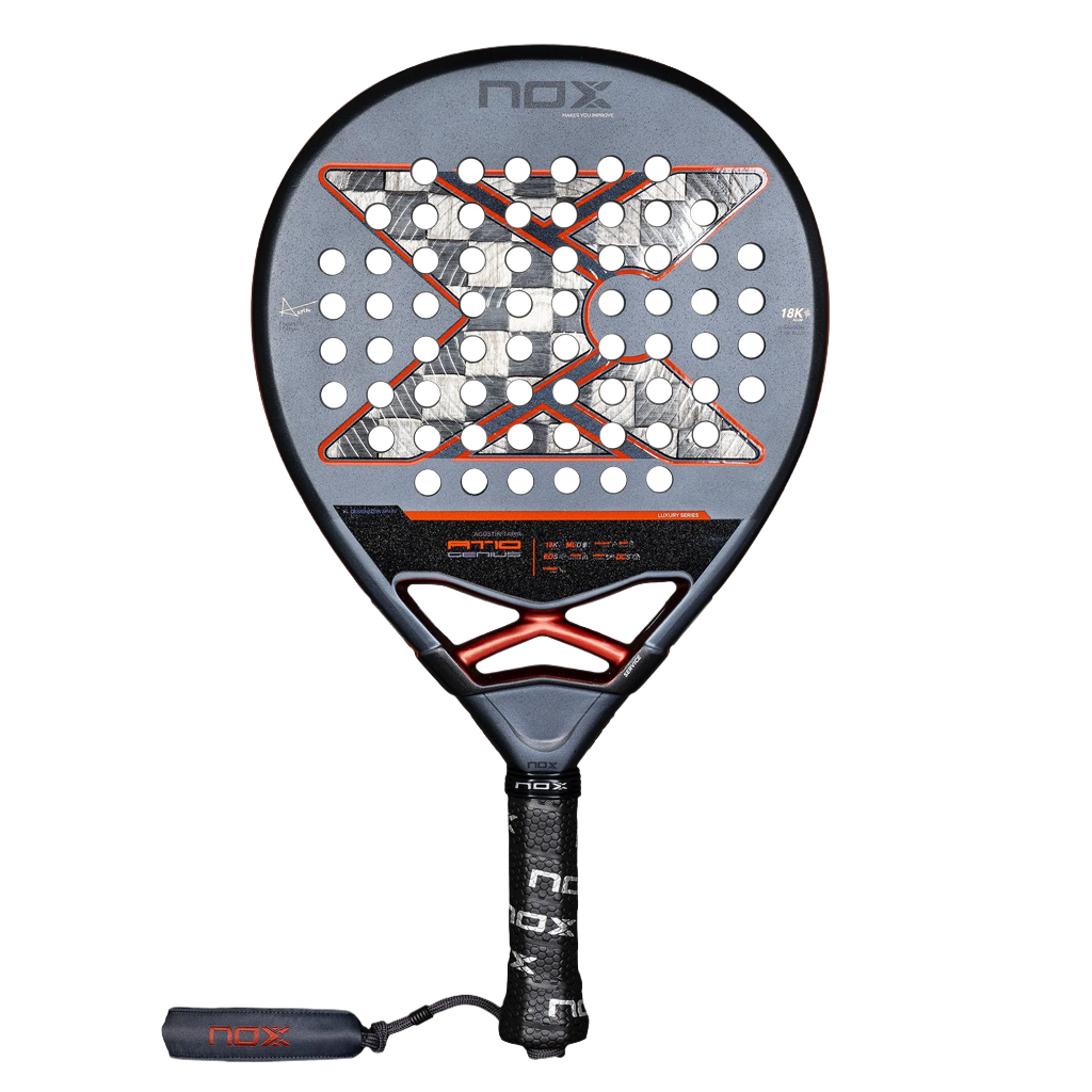 Raquete de Padel Nox AT10 Genius 18K Alum 2025, o Raquete de padel de Agustín Tapia para a temporada 2025. um Raquete de padel fabricado manualmente junto com Mozart de Catamarca com rosto Fibra de carbono aluminizado e com acabamento rugoso duplo (3D hexagonal no centro e textura areia no resto) melhora o Control e permite adicionar mais giro à bola. Este formato de versão Lágrima Integra-se dentro de um núcleo multicamadas que combina diferentes densidades de borracha para otimizar a saída da bola em golpes defensivos de baixa velocidade e potência nos chutes. Também incorpora tecnologia Nox personalizado Grip e Pulse Sytem que melhoram a absorção das vibrações que chegam à mão, reduzindo a fadiga articular